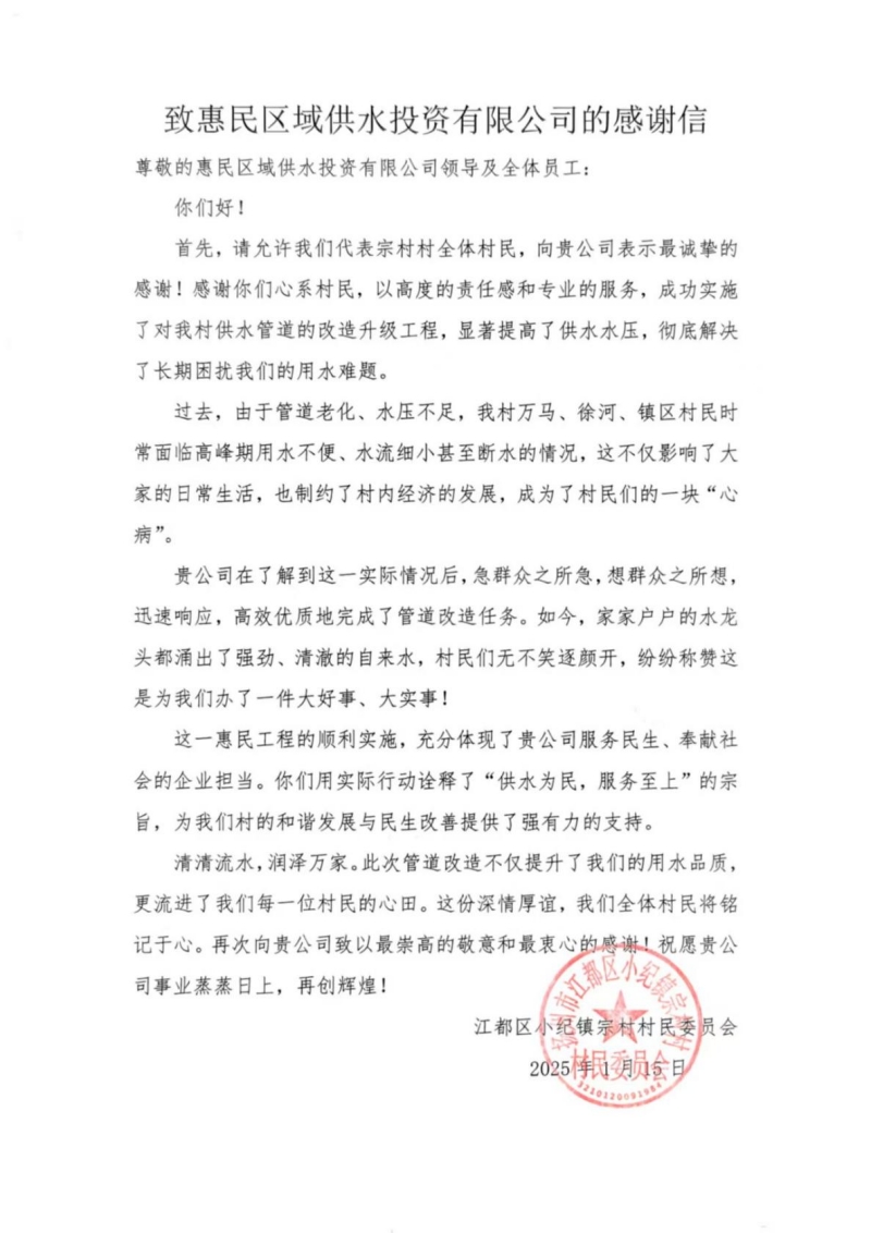 小紀(jì)供水管理所收到了一封飽含感激之情的感謝信是這樣說(shuō)的:“貴公司以高度的責(zé)任感和專業(yè)的服務(wù),成功實(shí)施了對(duì)我村供水管道的改造升級(jí)工程,顯著提高了供水水壓,徹底解決了長(zhǎng)期困擾我們的用水難題。”“清清流水,潤(rùn)澤萬(wàn)家。此次管道改造不僅提升了我們的用水品質(zhì),更流進(jìn)了我們每一位村民的心田。這份深情厚誼,我們?nèi)w村民將銘記于心。”捧著這封感謝信反復(fù)讀著、看著,供水人的內(nèi)心是“激動(dòng)的”,讓我們深切感受到付出被看見(jiàn)的溫暖,內(nèi)心充滿了難以言表的激動(dòng)與自豪。感動(dòng)之余,內(nèi)心也是“忐忑的”,我們更深刻地認(rèn)識(shí)到,信中的每一句感謝,都讓我們更加清醒地意識(shí)到身上所肩負(fù)的使命,責(zé)任感在心中愈發(fā)堅(jiān)定與強(qiáng)烈。